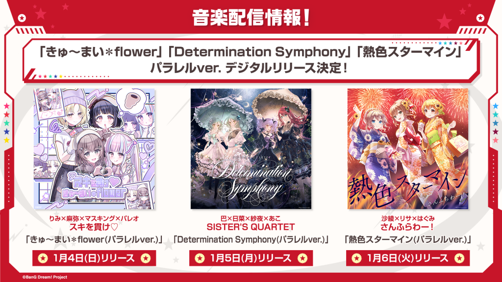 ・Afterglow・巴(CV:日笠陽子)、Pastel*Palettes・日菜(CV:小澤亜李)、Roselia・紗夜(CV:工藤晴香)、Roselia・あこ(CV:櫻川めぐ)をボーカルに迎えた「SISTER'S QUARTET」が歌唱する「Determination Symphony」