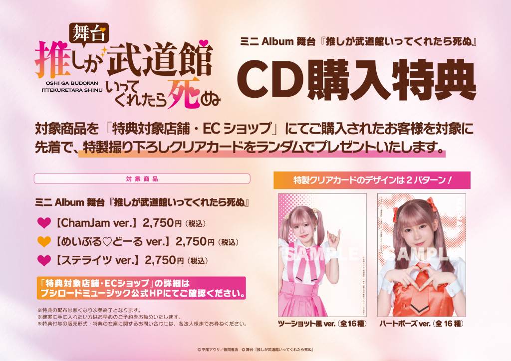 2026年4月22日(水)リリース ミニAlbum 舞台『推しが武道館いってくれたら死ぬ』(形態を問わず)を「特典対象店舗・ECショップ」にて購入されたお客様を対象に先着で、「特製撮り下ろしクリアカード」1枚をランダムでプレゼントいたします。