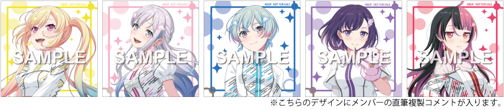「特典引換券」3枚使用の場合:各メンバーから対応するデザインの特典を1枚ずつ(計5枚)お渡し。
